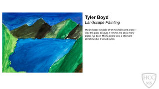 Every landscape painting, no matter how large, is a miniature compared to an actual landscape, yet still creates a world. Through the process of making their own landscape paintings, students have the exciting and empowering experience of creating the illusion of depth on a 2-dimensional surface. The students start by simplifying a photograph of their choosing into a few simple shapes (sky, background, middle ground and foreground) and then work back in with watercolor and watercolor crayons to create these scenes.